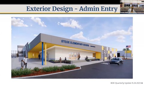 This rendering of the planned exterior of Stege Elementary, now under renovation, was shown at the Sept. 24 West Contra Costa school board meeting. (Screenshot captured by Samantha Kennedy / The CC Pulse)