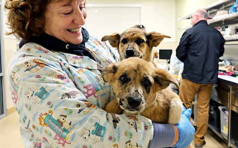 Janelle Clark holds two puppies being admitted to Joybound People & Pets in Walnut Creek on Jan. 13. The Joybound team drove to Palmdale, Calif. and picked up all the animals they could manage after the fires that ravaged Los Angeles County. (Cole Kuiper / Joybound People & Pets via Bay City News)