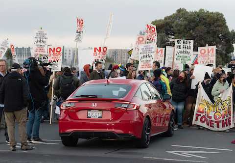 Protesters try to block the entrance to Coast Guard Island in Oakland on Thursday amid plans at the time for an increased presence of federal agents in the Bay Area called for by President Donald Trump. (Andres Jimenez Larios / Bay City News)