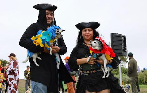 Winning the top prize were couple Louie Ponce and Gigi Bolaňos, dressed as pirates, and their dogs, Toby, 12, and Jack Jack, 4, dressed as parrots. Bolaňos says she has come to the event every year since getting Toby 10 years ago and made the costume by hand each time. This year’s costumes took her about a month to finish.