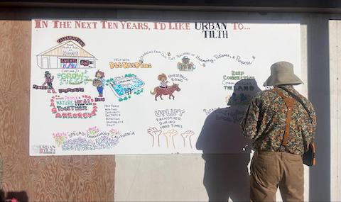- A visual note taker who works under the name Silent James draws up community responses to the question “In the next 10 years, I’d like Urban Tilth to…” at Urban Tilth’s 20th anniversary party on Oct. 11