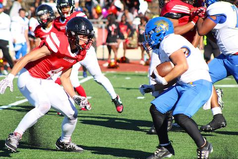 Salesian Prep senior Joseph Tarin, left, kicks up turf pellets as he breaks down for an open field tackle during the Pride’s 34-14 win Saturday over Pinole Valley High.