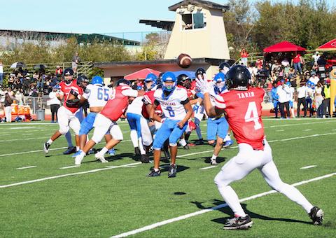 After another quick Pinole Valley three-and-out punt, the Pride again scored on a trick play, this time using a double pass that ended with Tarin throwing a touchdown from his receiver position to Perrilliat for his second of the first quarter.
