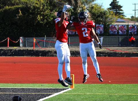 - Salesian senior Isaiah Latigue, right, celebrates his first quarter touchdown run with fellow senior Joseph Tarin.