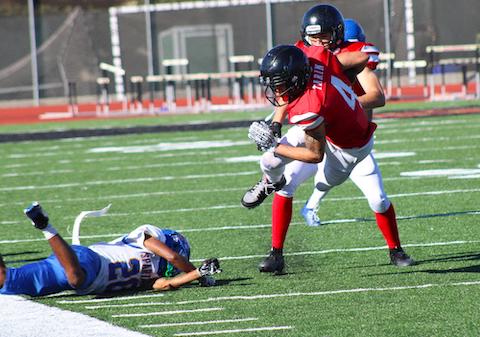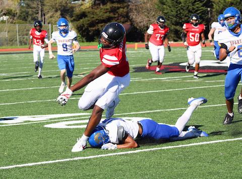 - Salesian senior Joseph Tarin goes airborne en route to a first down.