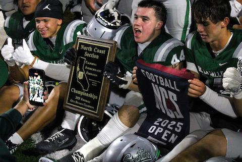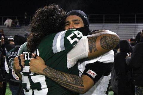 - The Spartans celebrate their win as senior linebacker Bubba Vargas, center, hoists the North Coast Section championship plaque.