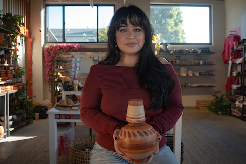 - Natalie Reyes holds a bottelon, or ceramic jug, in her Richmond store, Metztli.
