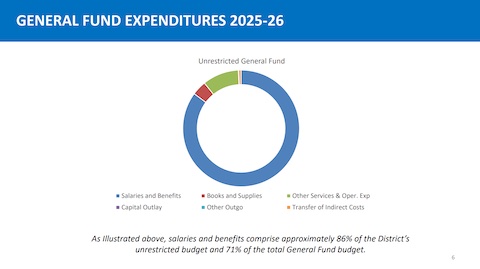 Most of the district’s budget is spent on salaries and benefits for employees. Around 86% of its unrestricted budget is used for salaries and benefits, according to Haria. That amounts to $78.2 million in salaries being paid out through the unrestricted and restricted funds for certificated staff, like teachers, in the 2025-26 year.
