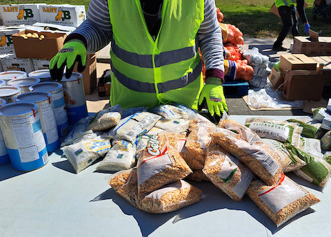 A volunteer gets ready to distribute groceries that include rice, beans, oats, vegetables and fruits at a Second Harvest Food Bank distribution site in San Jose in 2023. (Prachi Singh / Bay City News)